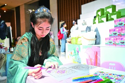 中國國家博物館內,觀眾在紙上進行文物紋樣涂鴉。新華社發