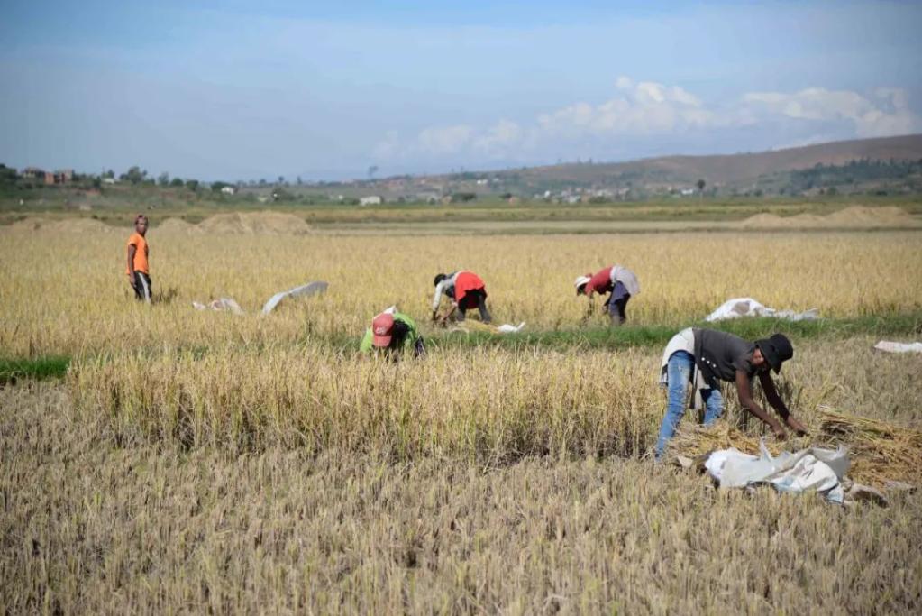 2023年5月12日,在馬達加斯加首都塔那那利佛附近的馬義奇鎮,農民在中國國家雜交水稻工程技術研究中心非洲分中心的試驗田里收割水稻。新華社發(西塔卡·拉喬納里松 攝)
