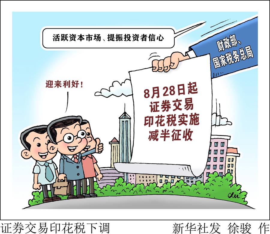 新華社北京8月27日電 記者27日從財政部了解到,財政部、國家稅務總局當日發布公告稱,為活躍資本市場、提振投資者信心,自2023年8月28日起,證券交易印花稅實施減半征收。