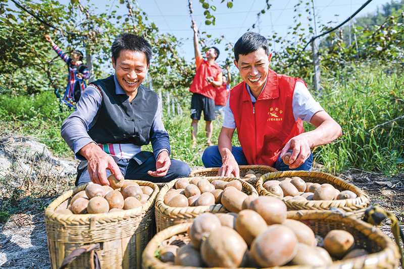 湖南省衡陽市黨員干部在常寧市塔山瑤族鄉陽山村幫助村民采摘獼猴桃(2023年9月攝) 周秀魚春攝