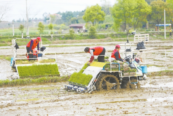 3月27日,道縣上關街道齊心村,和豐農機專業合作社農機手駕駛插秧機栽插早稻。氣溫回暖,該縣各地農民搶抓農時開展早稻育秧、犁田翻地、栽插秧苗等,為早稻增產豐收打好基礎。何紅福 攝(湖南圖片庫)