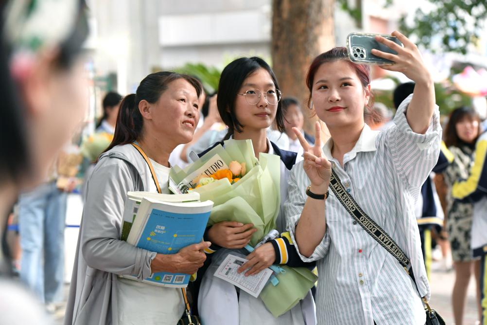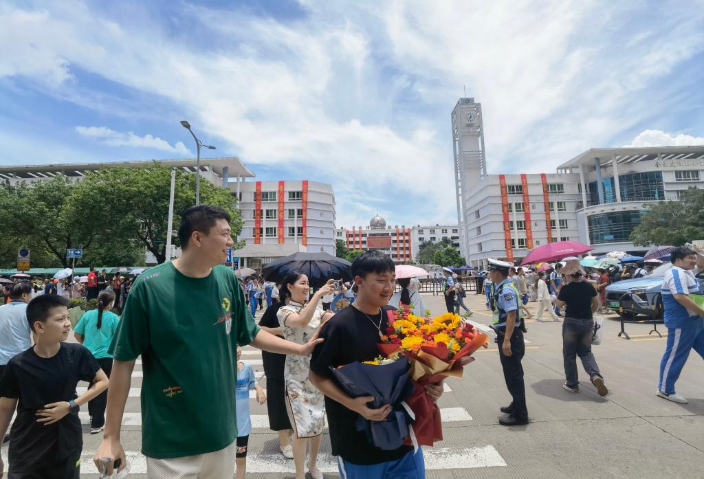 考生們從考場魚貫而出,家長們送上鮮花和擁抱,大家合影留念,記錄下青春歲月里的難忘時刻……