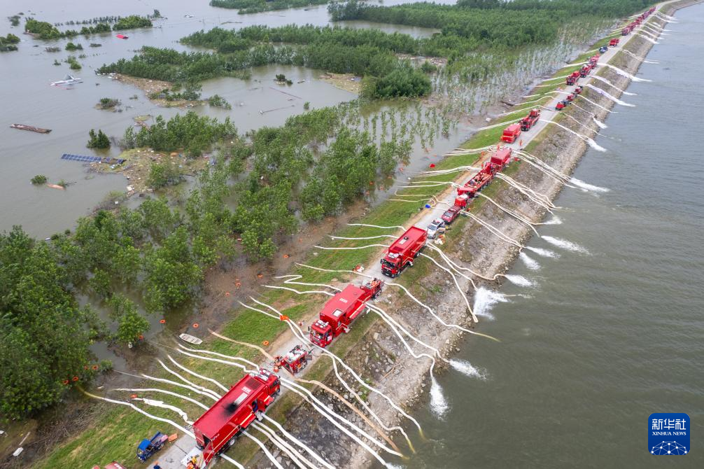 7月9日,在湖南省華容縣團洲垸洞庭湖大堤,排澇作業在進行中。新華社記者陳思汗攝