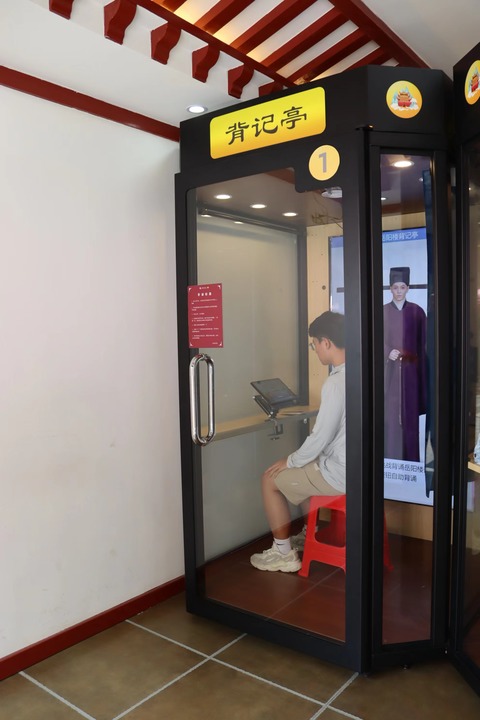 在國家5A級旅游景區岳陽樓門旁的智能背記亭,26歲的游客張江北通過背誦《岳陽樓記》,經數字人評定,得分100分,獲得“本人免票獎勵”。從高中初學此文到研究生畢業,多年過去,他依然能夠流利背誦。