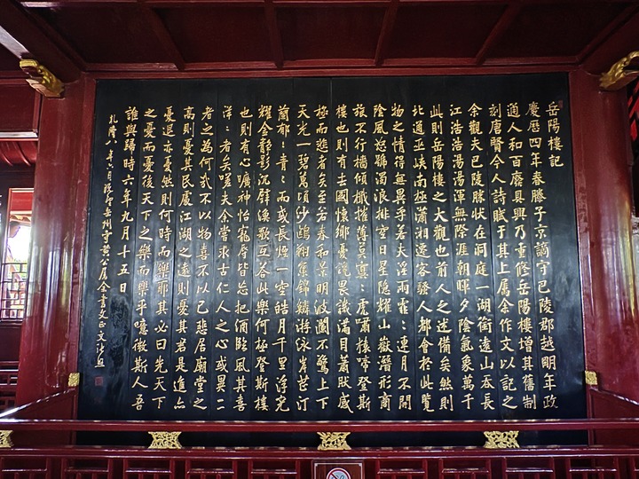 二樓嵌有“鎮樓之寶”《岳陽樓記》紫檀雕屏,為清代書法家張照所書,上面有多處修復過的痕跡。三樓上有杜甫《登岳陽樓》詩,筆意奔放,光彩照人。