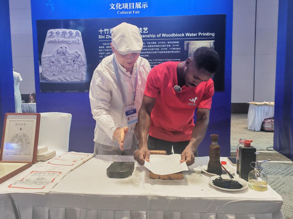 國家非遺項目木版水印技藝代表性傳承人魏立中介紹技法的同時,還向阿羅伽學習了幾句常用法語。魏立中說,文化重在交流、融合,一紙一墨能讓非洲友人沉浸式感受中國非遺。
