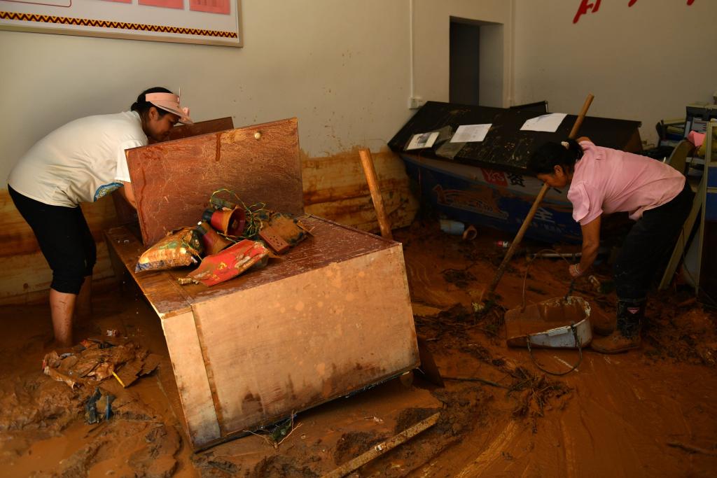 7月30日,在資興市八面山瑤族鄉青腰村,村民在清理淤泥和垃圾。  新華社記者 陳振海 攝