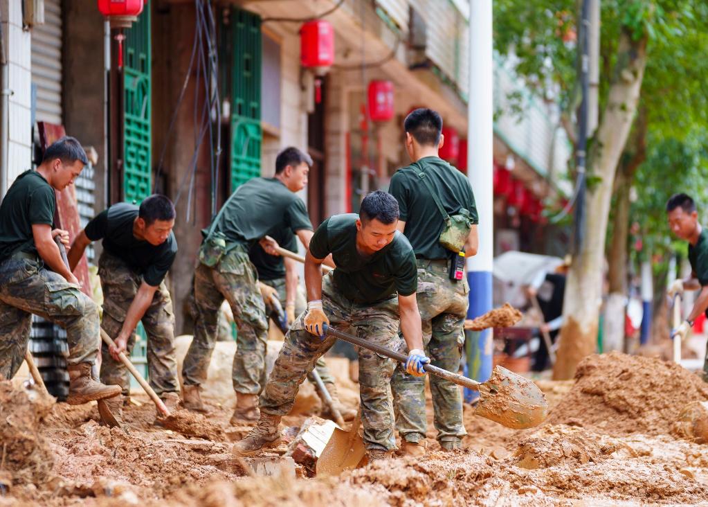 8月1日,武警湖南總隊郴州支隊官兵對資興市八面山瑤族鄉018縣道進行清淤任務,幫助當地群眾恢復道路交通。  新華社發(張森 攝)