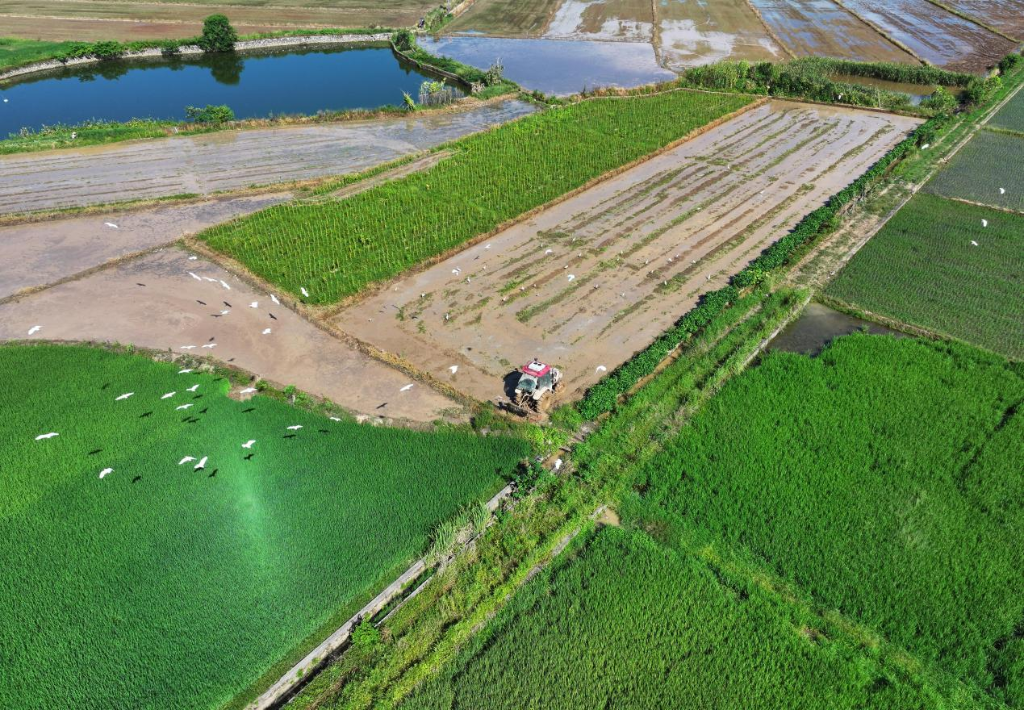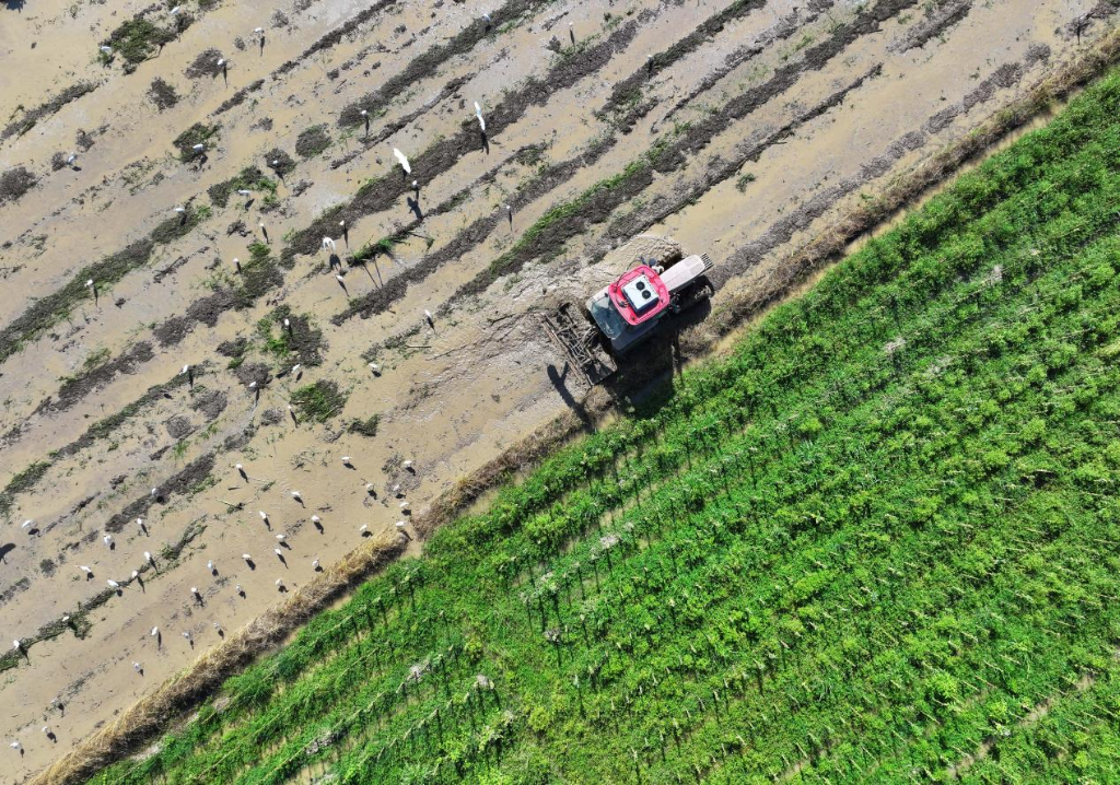湖南省常寧市蘭江鄉蘭江村,農民駕駛拖拉機在田間翻耕作業(無人機照片)
