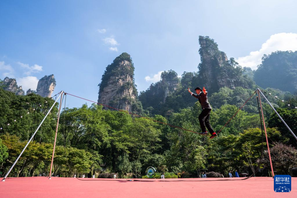 10月11日,來自俄羅斯的演員在張家界國家森林公園進行軟鋼絲雜技表演。新華社記者 陳思汗 攝