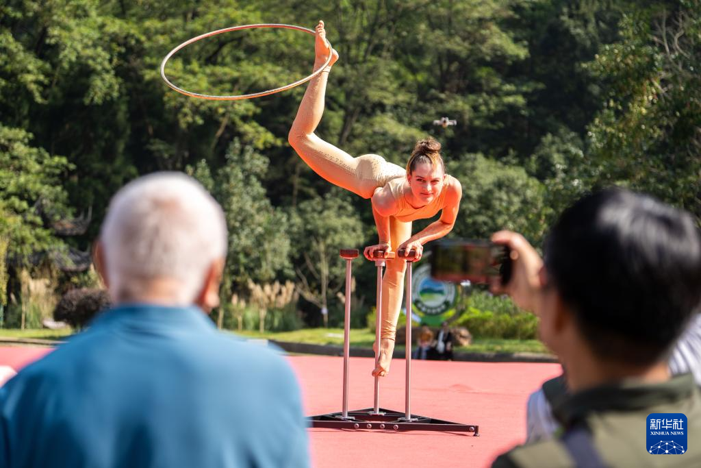 10月11日,來自德國的演員在張家界國家森林公園表演雜技《手平衡呼啦圈》。新華社記者 陳思汗 攝pagebreak