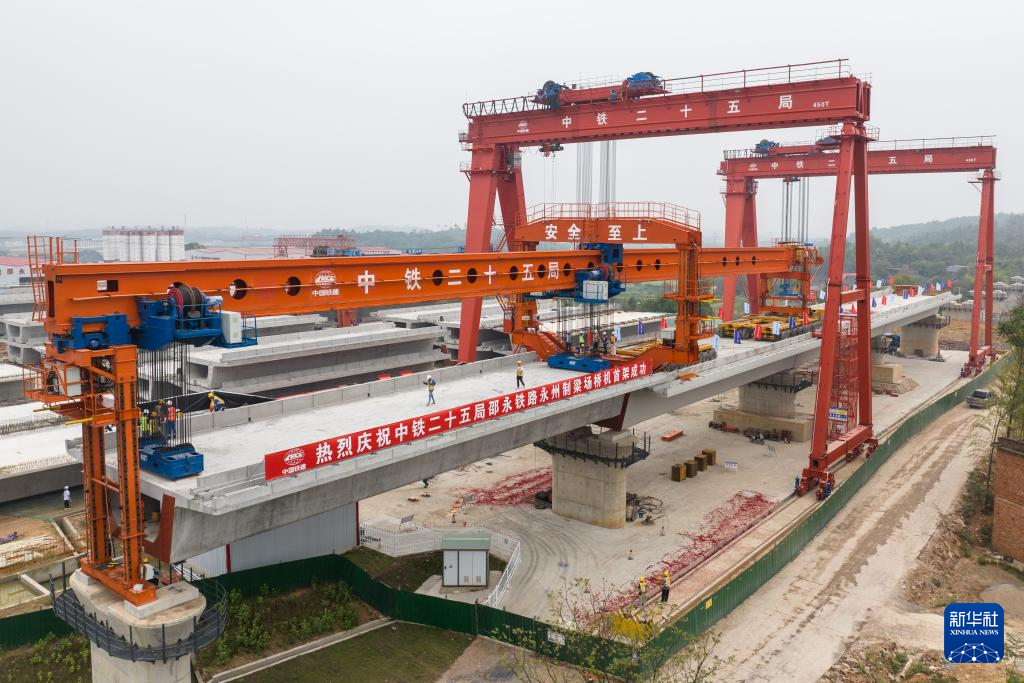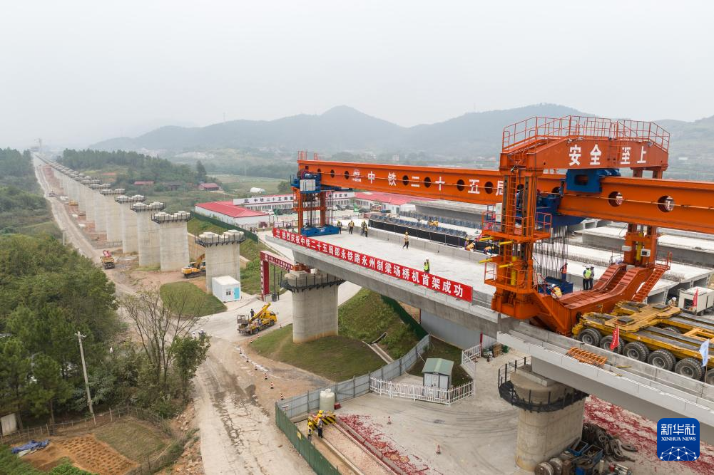 10月13日,在位于湖南省永州市的邵(陽)永(州)高鐵跨蘆洪江特大橋施工現場,一榀長32.6米、重近817噸的箱梁平穩架設,標志著由中鐵二十五局承建的邵永高鐵三標正式開始架梁,該條新建鐵路進入了架梁施工高峰階段。