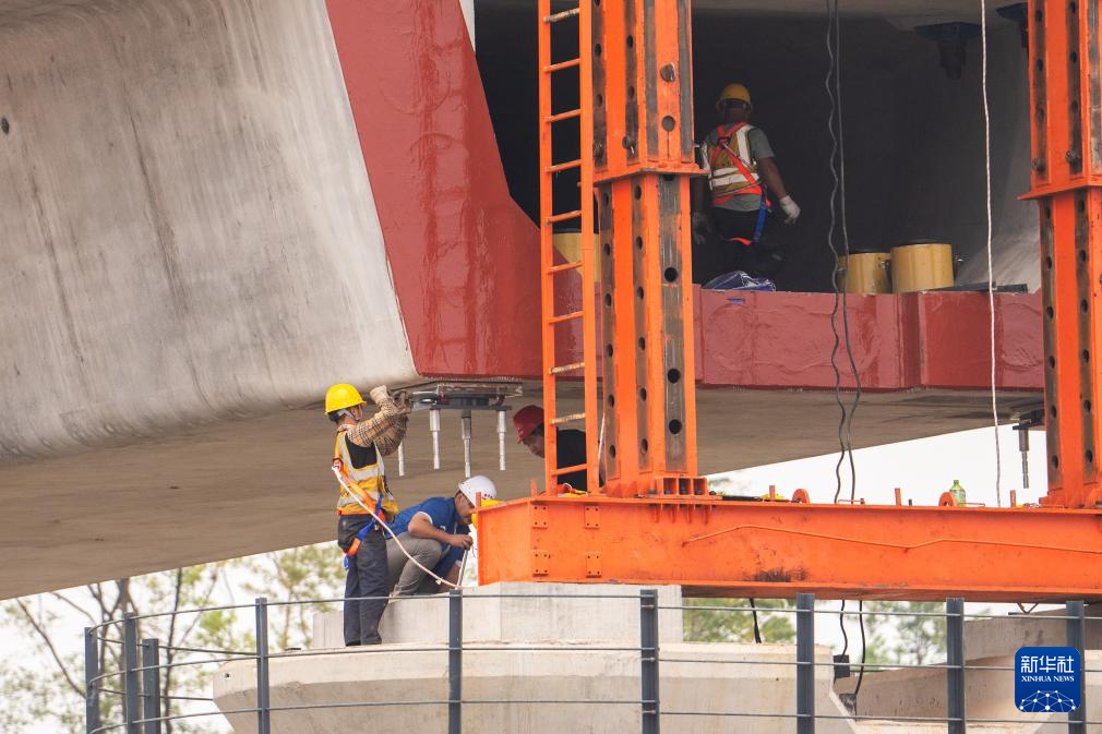 10月13日,中鐵二十五局工人在邵永高鐵跨蘆洪江特大橋架梁施工現場作業。新華社記者 陳思汗 攝