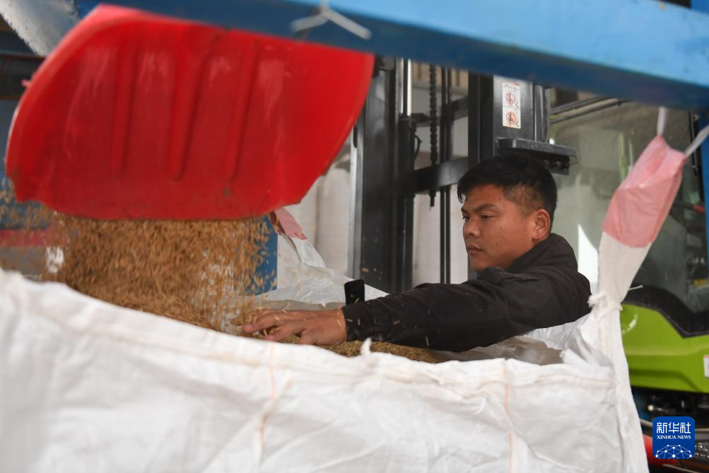 10月30日,邱彬將烘干后的稻谷裝袋。新華社記者 陳振海 攝pagebreak