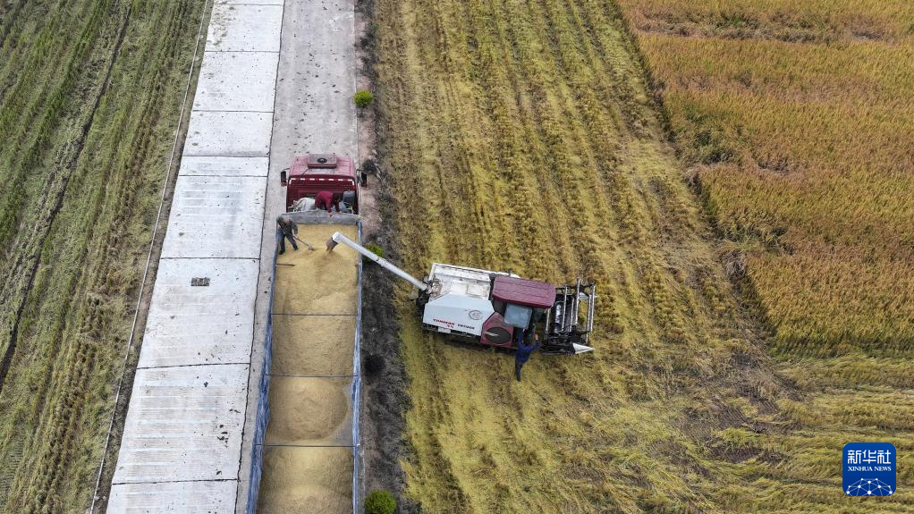 10月29日,在大通湖區河壩鎮王家湖村,農機手駕駛收割機將稻谷裝車(無人機照片)。新華社記者 陳振海 攝pagebreak